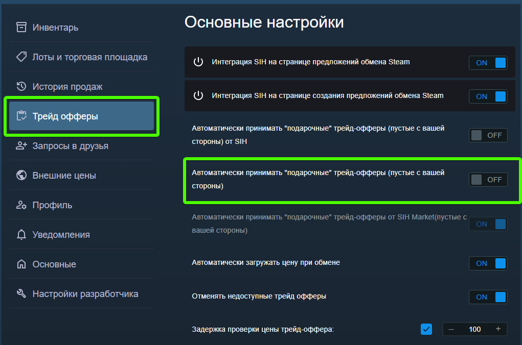 Если хотите **авто принятие трейдов** включаем этот тумблер: